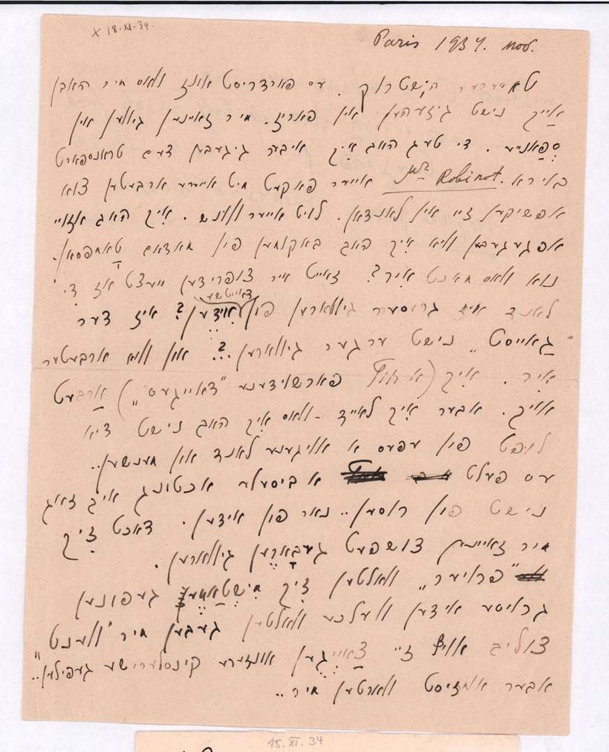 L.A.S. «Marc Chagall», Paris [15] novembre 1934, à Hermann STRUCK à Haifa (Palestine)| une page et quart in-4, enveloppe| en yiddisch.