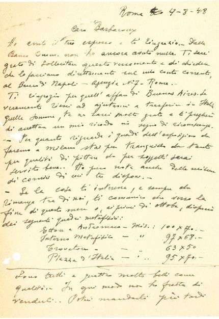L.A.S. « G. de Chirico », Rome 4 août 1948, à Vittorio BARBAROUX | 2 pages in-8 (trous de classeur touchant quelques mots, fentes, petits manques dans la marge gauche du second feuillet) | en italien.