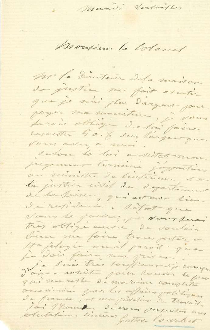 Lettre de prison, après sa mise en accusation pour la destruction de la colonne Vendôme. [Courbet a été transféré de l'Orangerie à la maison de justice de Versailles, avant d'être conduit à Sainte-Pélagie.] «Mr le Directeur de la maison de justice me fait avertir que je n'ai plus d'argent pour payer ma nourriture, je vous serais obligé de lui faire remettre 50 f. sur l'argent que vous avez à moi. Selon la loi aussitôt mon jugement terminé j'appartiens au ministre de l'Intérieur et à la justice civile du département de la Seine, qui est mon lieu de résidence. Sitôt que vous le pourrez, je vous serai très obligé encore de vouloir bien me faire transporter à Ste Pélagie où il paraît que je dois faire ma prison. Je suis très souffrant et je manque d'air - ensuite pour sauver le peu qui me reste de ma ruine complette occasionnée par les affaires politiques de France, et ma privation de travail»...