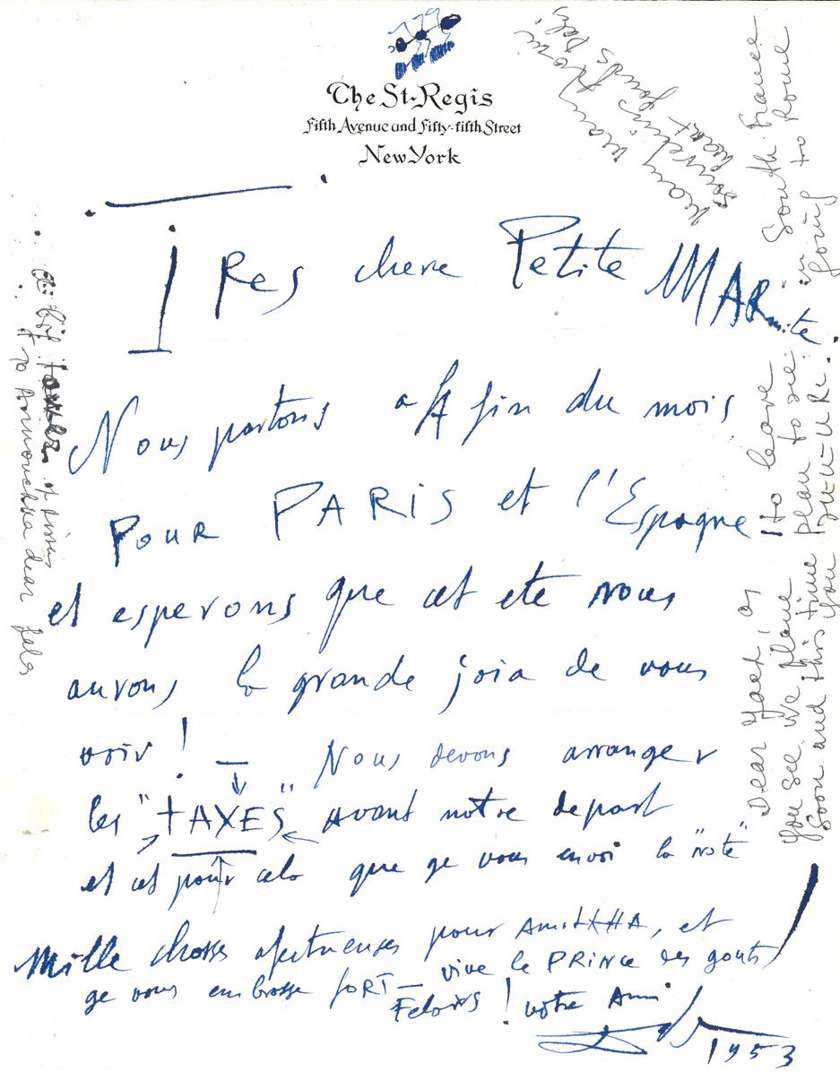 L.A.S. «Dali» avec DESSIN, New York 1953| 1 page in-4, en-tête The St Regis. «Très chère Petite MARmite. Nous partons à la fin du mois pour Paris et l'Espagne et espérons que cet été nous aurons la grande joia de vois voir ! - Nous devons arranger les “taxes” [le mot en entouré de quatre flèches] avant notre départ et cet pour cela que je vous envoie la “note”»... Il termine: «Vive le Prince des gouts Felows !»... Au dessus de l'en-tête, il a dessiné à l'encre une fourmi... GALA a écrit dans les marges quelques lignes en anglais adressées à «Dear Jack», lui recommandant d'embrasser Annouchka...
