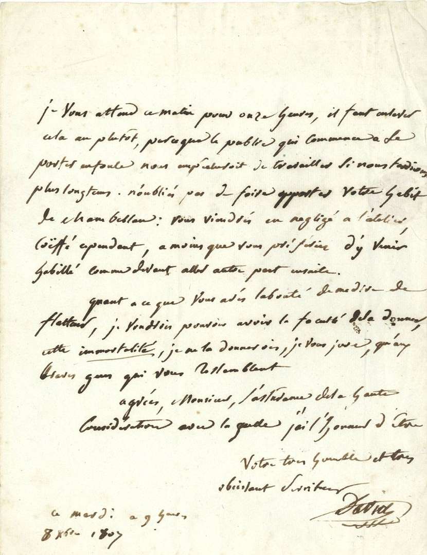 L.A.S. «David», mardi à 9 heures 8 décembre 1807, au marquis de BAUSSET, chambellan de l'Impératrice| 1 page in4, adresse (biffée).
