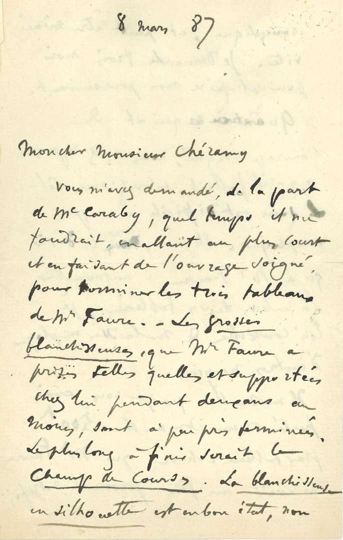 Au sujet de l'achèvement des toiles promises au baryton et collectionneur Jean-Baptiste Faure, qui lui a intenté un procès. [C'est Manet qui avait mis Degas en relation avec le chanteur Jean-Baptiste FAURE (1830-1914). En 1874, Degas avait demandé à Faure de racheter pour lui à Durand-Ruel six tableaux dont il était mécontent, s'engageant à peindre en échange quatre grandes compositions| douze ans plus tard, Degas n'ayant pas terminé certains de ces tableaux, Faure lui intenta un procès, qu'il gagna, pour en obtenir la livraison. Degas avait choisi pour défenseur l'avoué et collectionneur Paul-Arthur CHÉRAMY (1840-1912).] «Vous m'avez demandé, de la part de Me Caraby, quel temps il me faudrait, en allant au plus court et en faisant de l'ouvrage soigné, pour terminer les trois tableaux de Mr Faure. Les Grosses blanchisseuses, que Mr Faure a prises telles quelles et supportées chez lui pendant deux ans au moins, sont à peu près terminées. Le plus long à finir serait le Champ de Courses. La blanchisseuse en silhouette est en bon état, non compliqué, et peut être menée vite. Je demande trois mois pour satisfaire mon poursuivant. Quant à ce qui est de l'ouvrage soigné, vous avez répondu ce qu'il fallait, m'avez-vous dit. Le soin est difficile à ne pas employer. Et puis, avec le désir qu'a Mr Faure d'augmenter la valeur de ses tableaux, je lui conseille de me laisser employer d'autres moyens. Il me semble que je vous avais parlé d'une somme de 500 F par tableau achevé que Mr Faure m'avait un peu promise, autrefois. Je ne tiens pas à lui rappeler cette offre. Mr Faure a été trop longtemps mon créancier. Je l'ai fait trop attendre pour ne pas en rester là. N'en disons donc rien»...