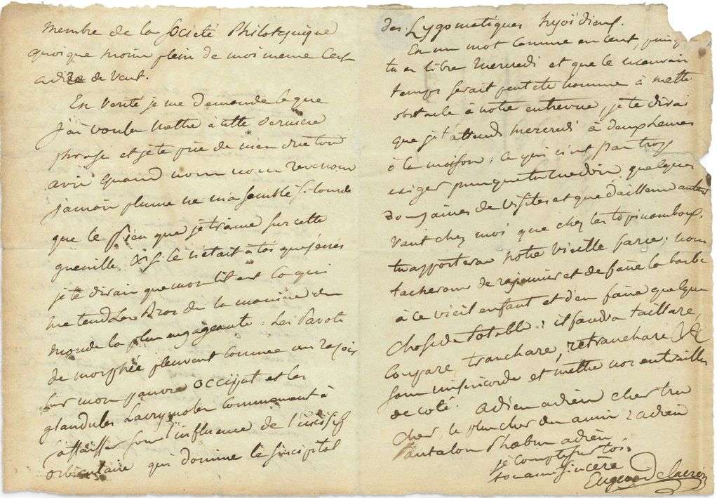 Une des toutes premières lettres connues de Delacroix. [Achille PIRON (1798-1865), condisciple de Delacroix au Lycée impérial (Louis-le-Grand), restera un de ses plus proches amis, jusqu'à la mort du peintre qui en fera son légataire universel. Il fera toute sa carrière dans l'administration des Postes.] «Amuses toi, mon cher ami, loin de te blâmer j'envie ton bonheur & la partie de chasse aurait aussi pour moi de furieux attraits| j'ai enragé dimanche| mais comme cela ne mêne à rien j'ai pris mon parti. - Je te dirai en passant que ce chiffon me coûte des peines infinies| il s'est trouvé que j'avais perdu MA plume ordinaire c'est-à-dire celle qui depuis ma sortie du Lycée environ me servait de secrétaire intime| de sorte qu'il a fallu en tailler une avec un canif... quel canif Bon Dieu ! la première lardoire qui m'est tombée sous la main. Ne t'étonnes donc pas si je suis aujourd'hui plus bête qu'un membre de la Société Philoteqnique quoique moins plein de moi-même c'est-à-dire de vent. [...] Jamais plume ne m'a semblé si lourde que le pieu que je traîne sur cette guenille, & si ce n'était à toi que j'écris je te dirais que mon lit est ce qui me tend les bras de la manière du monde la plus engageante. Les pavots de Morphée pleuvent comme un rasoir sur mon pauvre occiput et les glandules lacrymales commencent à s'affaisser sous l'influence de l'incisif orbiculaire qui domine le sincipital des zygomatiques hyoïdiens».