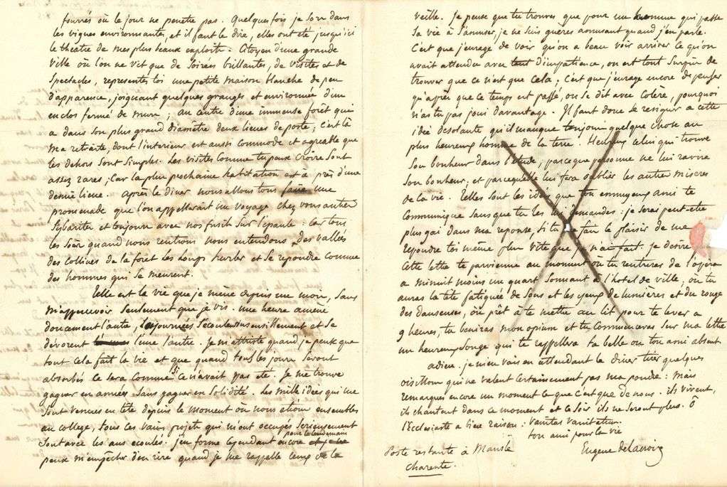 L.A.S. «Eugène Delacroix», «à la maison des gardes de la forêt de Boixe» 9 «novembre» [pour octobre] 1818, à Achille PIRON, «Employé de l'administration des Postes, Hôtel des Postes», à Paris| 3 pages in-4, adresse (adresse biffée avec quelques corrosions d'encre).
