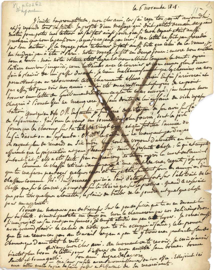 2 L.A.S. «Eugène Delacroix», novembre-décembre 1818, à Achille PIRON, «employé à l'administration des Postes, Hôtel des Postes», à Paris| 1 page in-4 avec adresse au verso (adresse biffée avec petites corrosions d'encre, et déchirure au cachet enlevant 5 fins de lignes), et 1 page in-8 avec adresse. [Forêt de Boixe] 6 novembre 1818. Il lui répond par retour pour que «ma lettre ne soit pas précédée par son auteur. Si le voyage pour retourner se fait aussi vite que celui de la venue, je ne tarderai pas à être à Paris. Notre voyage se fit en deux jours| encore nous arrêtâmes-nous à Tours. Mais notre voiture était légère et nous allions comme le vent. Depuis Poitiers environ jusqu'ici, nous luttâmes avec le Courrier et nous eûmes plus d'une fois le plaisir de lui passer devant. Je crains malheureusement que les chemins ne nous permettent pas en retournant cette charmante allure. [...] Quoi qu'en dise M. Enfantin je suis forcé de n'être pas de son avis sur l'a[rticle] de la fourrure. J'ai sous les yeux un bonnet des plus fourrés, dont les poils so[nt plus] fermes que les cheveux sur ta tête de vingt ans, et qui fut tué l'année de[rnière à] la fin d'août ou en septembre. M.Mrs les gardes qui ne manquent pas d'expér[ience disent qu']ils voient plus de renards en six mois que nous ne voyons d'alouettes en un [an, ils] assurent que la préparation est pour beaucoup dans la présente chose: ce qui est important surtout c'est si elle a été faite peu ou beaucoup de temps après la mort de l'animal. Comme la chasse retient dans ce pays à une part de mes regrets j'ose espérer que tu me feras partager quelques-unes de tes parties surtout sous les auspices d'un chasseur comme Mr Buissonneau qui m'a l'air d'être plus fort sur l'abstrait de la chasse que sur le concret, je veux dire sur la théorie que sur la pratique. Quand ce ne serait que pour tirer quelques alouettes, le plaisir de brûler de la poudre est quelque chose pour un apprenti». Il évoque les soirées musicales avec PIERRET et sa flûte: «Viendra peut-être un temps où nous le charmerons par nos délicieux duos. Si mes projets ne s'en vont pas en fumée, je compte étudier un peu cet hiver. Je verrai aussi avec grand plaisir le cahier de notes que tu t'es occupé à faire| cela prouve que tu ne renonces pas au travail et peu à peu tu y trouveras peut-être plus de charmes que dans tout le reste»... [Paris] 16 décembre 1818. Il le charge d'envoyer un paquet à Bordeaux. «J'eusse désiré te le porter moi-même, car il y a fort longtemps que je ne t'ai vu. Mais cela m'a été impossible et je ne sais encore quand je pourrai avoir ce plaisir»...