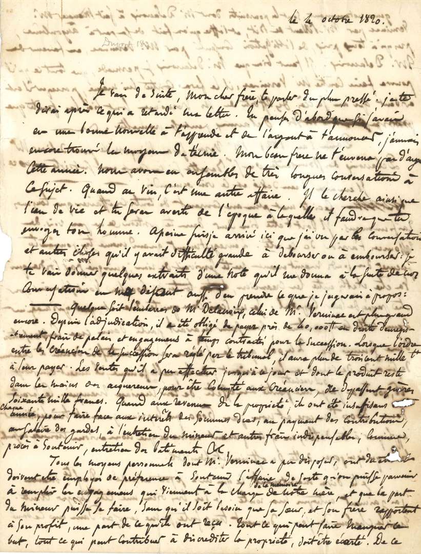 L.A. (la fin manque), [forêt de Boixe] 4 octobre 1820, à son frère le général Charles-Henri DELACROIX| 2 pages in-4 (manque le dernier feuillet).