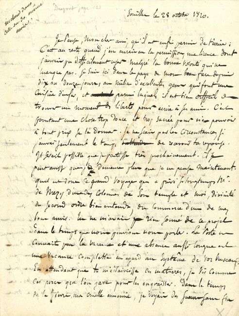 L.A.S. «E. Delacroix», Souillac 28 octobre 1820, à Achille PIRON, «employé des Postes, Hôtel des Postes», à Paris| 3 pages in-4, adresse (adresse biffée avec petites corrosions d'encre).