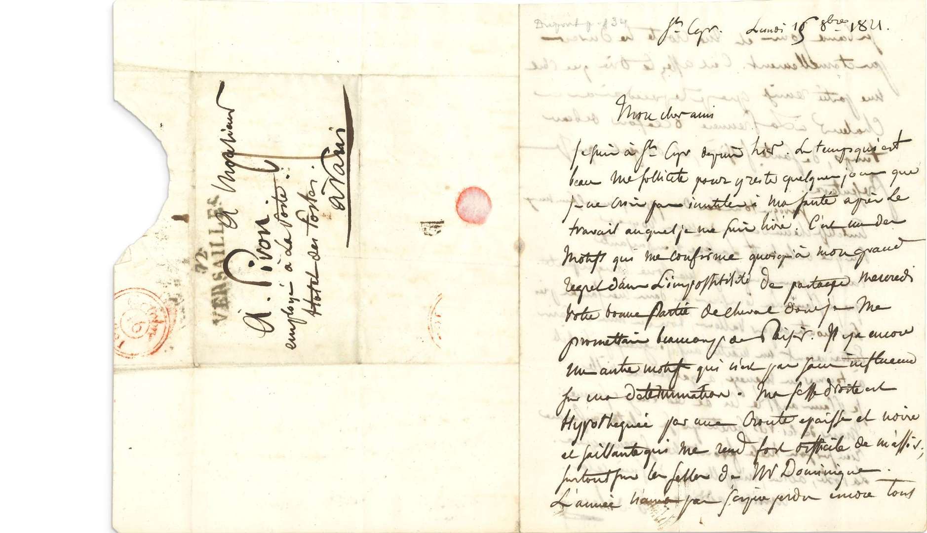 Il est à Saint-Cyr: «Le temps qui est beau me sollicite pour y rester quelques jours que je ne crois pas inutiles à ma santé après le travail auquel je me suis livré [pour La Barque de Dante]. C'est un des motifs qui me confirme quoiqu'à mon grand regret dans l'impossibilité de partager mercredi votre bonne partie de cheval dont je me promettais beaucoup de plaisir. Il y a encore un autre motif qui n'est pas sans influencer ma détermination. Ma fesse droite est hypothéquée par une croûte épaisse et noire et saillante qui me rend fort difficile de m'assoir| surtout sur les selles de Mr Dominique. L'année n'aura pas j'espère perdu encore tous ses beaux jours et ma croûte ne durera pas éternellement. C'est assez .te dire que c'est une partie remise que je reprendrai avec chaleur à la première occasion de beau temps, de santé fessière, et d'argent qui se présentera».