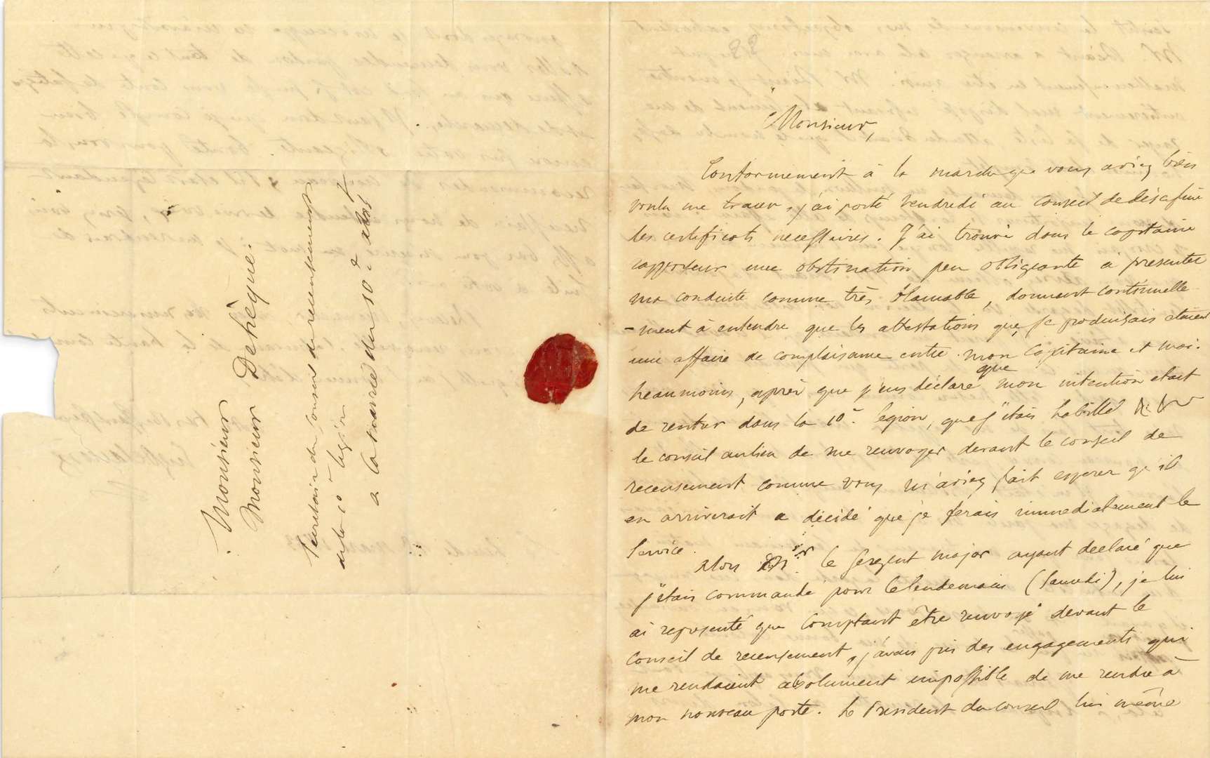 Il exprime son mécontentement au secrétaire du conseil de recensement de la 10e Légion de la Garde nationale. Ayant présenté les certificats nécessaires, il a «trouvé dans le capitaine rapporteur une obstination peu obligeante à présenter ma conduite comme très blamable», et à considérer les attestations comme «une affaire de complaisance». Le sergent major voulait l'obliger à monter la garde le lendemain: «Il m'était absolument impossible, vu l'urgence de dégager ma parole vis-à-vis des personnes à qui j'avais donné jour pour mes travaux du lendemain matin», et il avait déjà monté la garde une dizaine de jours plus tôt. «J'aurais été moi-même vous expliquer tout cela, si l'espérance de remettre au Salon divers ouvrages dont je m'occuppe ne m'avait privé d'aller vous demander pardon» des ennuis de cette affaire...