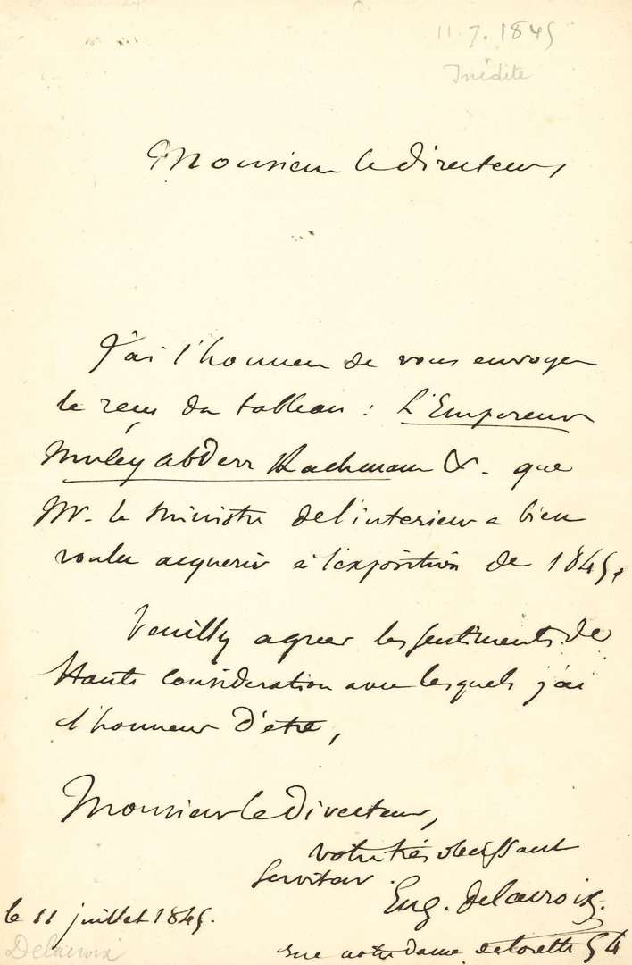 L.A.S. «Eug. Delacroix», 11 juillet 1845, à un directeur [Edmond CAVÉ, directeur des Beaux-arts au ministère de l'Intérieur ?]| 1 page in-8. «J'ai l'honneur de vous envoyer le reçu du tableau: L'Empereur Muley Abderr Rachman &c que Mr le ministre de l'intérieur a bien voulu acquérir à l'exposition de 1845»... Il donne son adresse: «rue Notre-Dame de Lorette 54».