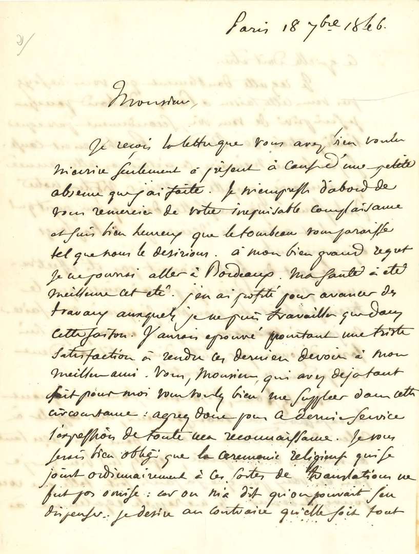 Il est heureux que le tombeau lui paraisse tel qu'ils le désiraient. «À mon bien grand regret je ne pourrai aller à Bordeaux. Ma santé a été meilleure cet été. J'en ai profité pour avancer des travaux auxquels je ne puis travailler que dans cette saison. J'aurais éprouvé pourtant une triste satisfaction à rendre ces derniers devoirs à mon meilleur ami. Vous, Monsieur, qui avait déjà tant fait pour moi vous voulez bien me suppléer dans cette circonstance [...]. Je vous serais bien obligé que la cérémonie religieuse qui se joint ordinairement à ces sortes de translations ne fût pas omise: car on m'a dit qu'on pouvait s'en dispenser. Je désire au contraire qu'elle soit tout ce qu'elle doit être. [...] Le port du buste n'avait pas été effectivement payé à Paris: je pensais ainsi que le transport serait plus prompt. J'espérais vous faire ces jours-ci un petit envoi que je suis forcé d'ajourner par suite d'un petit accident indépendant de ma volonté»...