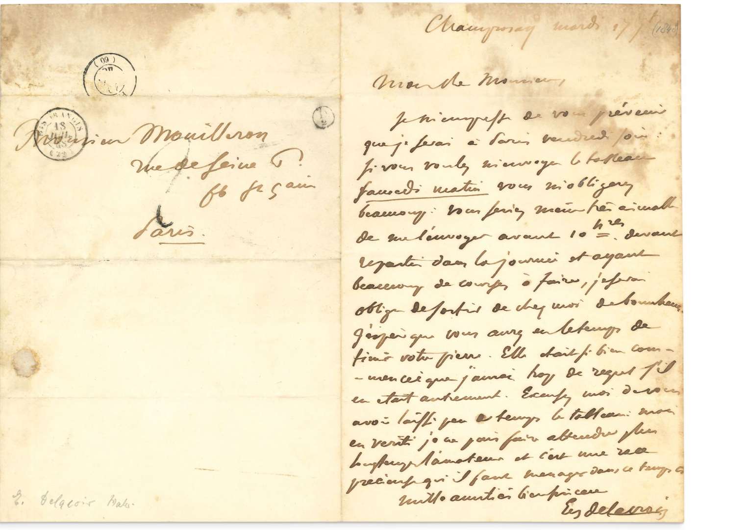 L.A.S. «Eug. Delacroix», Champrosay 17 juillet [1848], au lithographe Adolphe MOUILLERON| 1 page in-8, adresse (légères rousseurs).