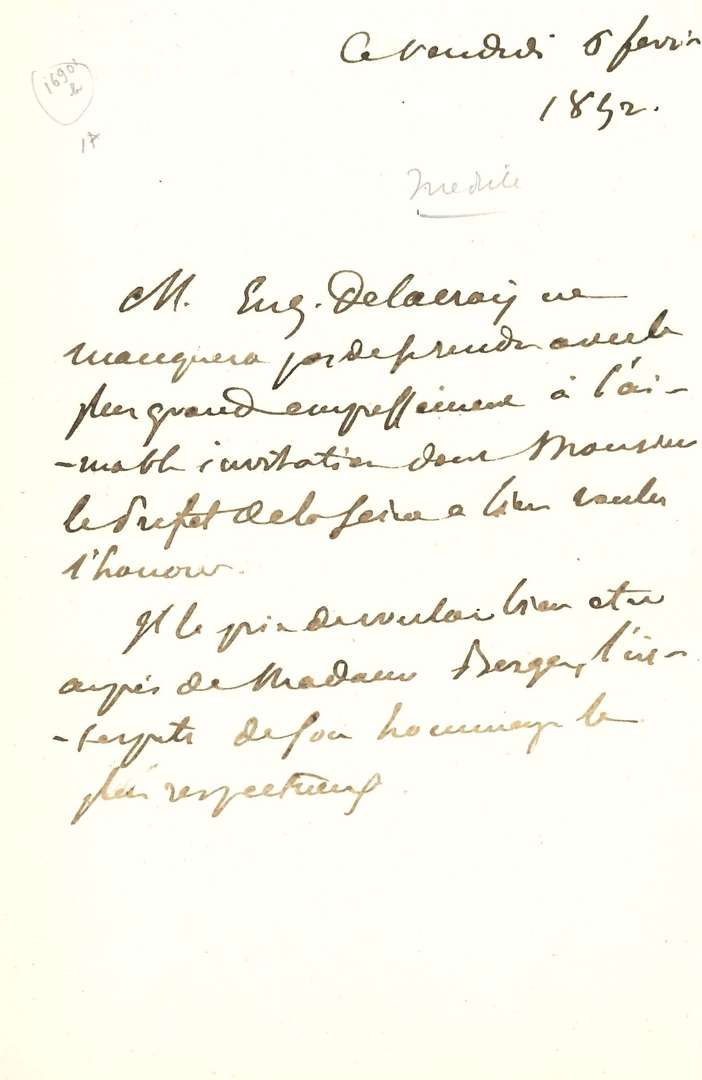 2 L.A.S. «Eug. Delacroix» (une à la 3e personne), et une invitation imprimée avec 3 lignes a.s. «ED», 1852-1856| 1 page in-8, 3 pages in-8 impr., et . 6 février 1852, [à Jean-Jacques BERGER]. «M. Eug. Delacroix ne manquera pas de prendre avec le plus grand empressement à l'aimable invitation dont Monsieur le Préfet de la Seine a bien voulu l'honorer»... [Mars 1854]. Invitation à visiter ses peintures dans le Salon de la Paix de l'Hôtel de Ville. Il a ajouté de sa main: «J'ai fait des changements notables dans le ciel du plafond, qui ont amélioré l'ensemble»... L'invitation donne le détail des peintures du plafond principal, des huit caissons qui l'entourent, et des onze sujets de la vie d'Hercule. 10 décembre 1856. «Je serai tout prêt à vous recevoir si vous voulez bien prendre la peine de passer demain jeudi entre 1 et 2 heures. Je ne suis pas très libre de mes moments»...
