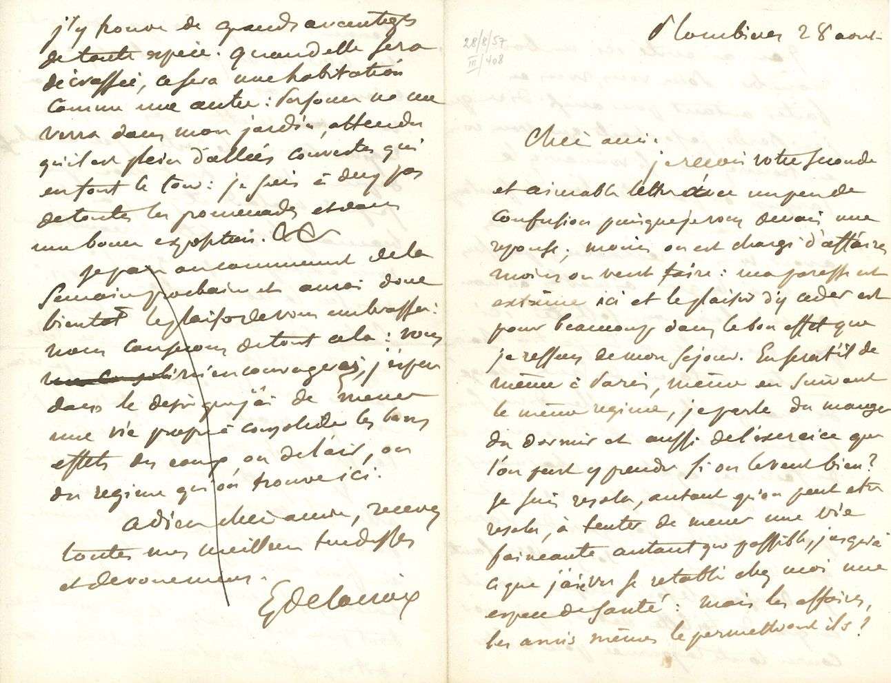 L.A.S. «EDelacroix», Plombières 28 août [1857], à Joséphine de FORGET| 4 pages in-8.