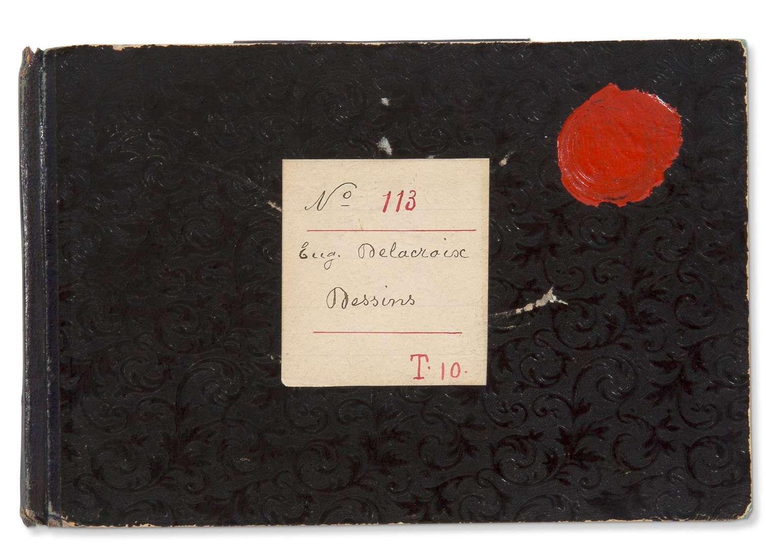 CARNET avec DESSINS et notes autographes, 1857-1858| carnet oblong in-12 (10,2 x 16 cm) de 48 ff. (dont 20 vierges), dos de basane noire, plats de papier noir gaufré de rinceaux végétaux, porte-crayon en basane sur la chasse supérieure du plat inf.| étiquette manuscrite sur le plat sup. (N° 113/ Eug. Delacroix/ Dessins/ T.10) et cachet de l'atelier en cire rouge au chiffre ED| étiquette du papetier à l'intérieur (J. Berville, Rue de la Chaussée-d'Antin, N° 39).