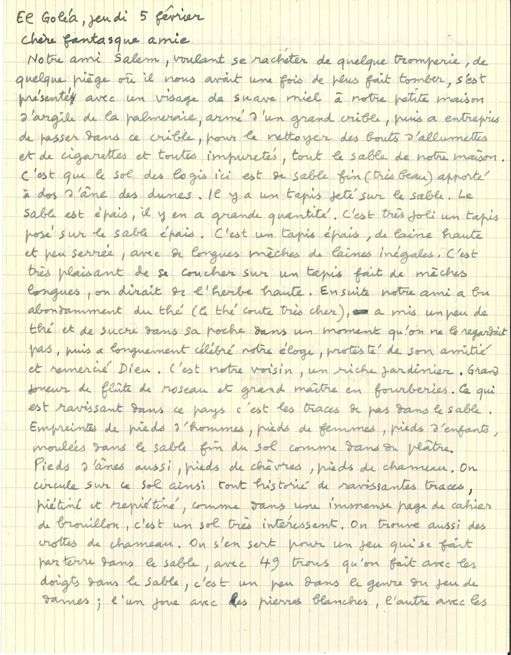 60725 DUBUFFET Jean (1901-1985). L.A.S. « Jean Dubuffet », El Golea 5 février [1948], à Florence GOULD sa « chère fantasque amie » | 1 page et demie in-4, enveloppe.~