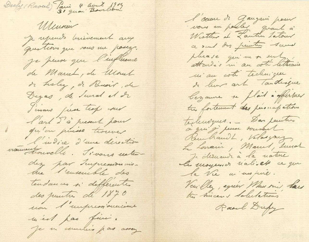 L.A.S. «Raoul Dufy», Paris «31 quai Bourbon» 4 avril 1905| 2 pages in-8.