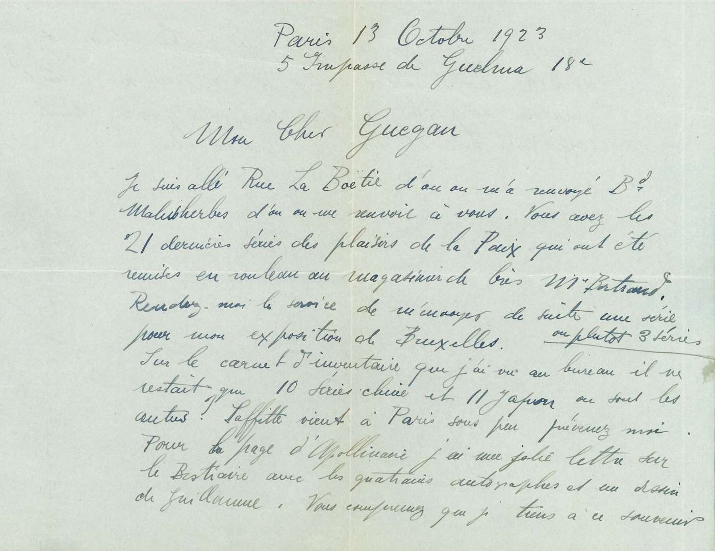 Sur sa suite gravée Les Plaisirs de la Paix, et Le Bestiaire d'Apollinaire. [Dufy avait publié la suite de quatre bois gravés Les Plaisirs de la Paix en 1919, aux Éditions de la Sirène, dont Paul Laffitte fut le créateur et Bertrand Guégan le directeur artistique. À la date de cette lettre, La Sirène avait été reprise par l'éditeur Georges Crès.] ... «Vous avez les 21 dernières séries des plaisirs de la Paix qui ont été remises en rouleau au magasinier de Crès Mr Bertrand. Rendez-moi le service de m'envoyer de suite une série ou plutôt 3 séries pour mon exposition de Bruxelles [à la galerie Le Centaure]. Sur le carnet d'inventaire que j'ai vu au bureau il ne restait que 10 séries chine et 11 Japon, où sont les autres ? Laffitte vient à Paris sous peu, prévenez-moi.