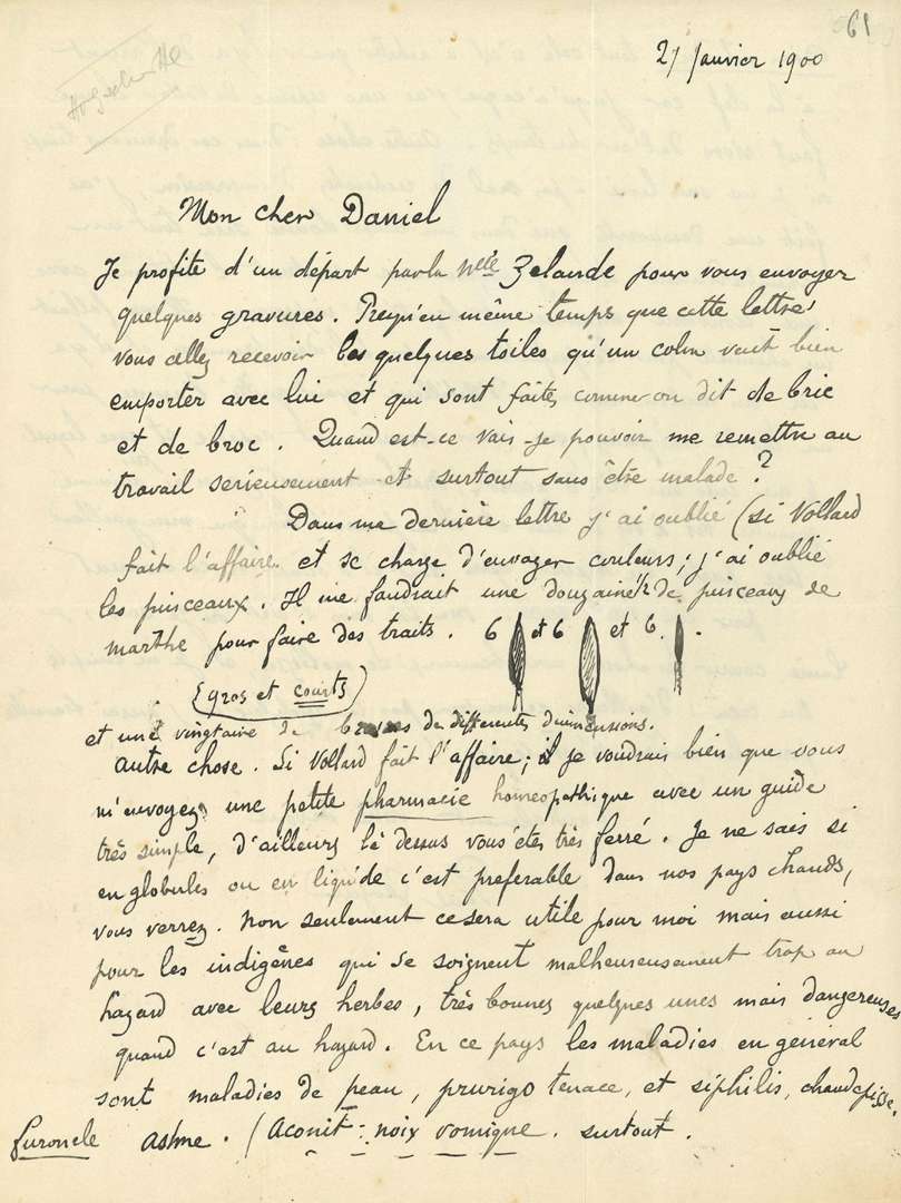 Dans ma dernière lettre j'ai oublié (si Vollard fait l'affaire et se charge d'envoyer couleurs| j'ai oublié les pinceaux. Il me faudrait une douzaine ½ de pinceaux de marthe [sic] pour faire des traits, gros et courts, [Gauguin dessine trois pinceaux de taille différente], et une vingtaine de brosses de différentes dimensions.