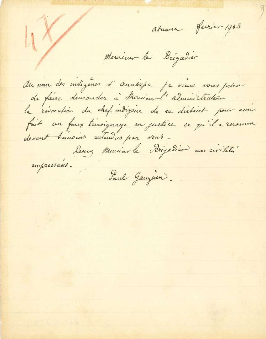 L.A.S «Paul Gauguin», Atuana février 1903, au brigadier CLAVERIE: demi-page in-4. «Au nom des indigènes d'Anaiapa je viens vous prier de faire demander à Monsieur l'administrateur la révocation du chef indigène de ce district pour avoir fait un faux témoignage en justice ce qu'il a reconnu devant témoins entendus par vous»...