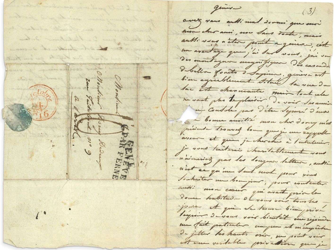 S'il a mal dormi, du moins est-il à Genève. «J'ai vu des montagnes magnifiques, des cascades, de belles forêts de sapins. Genève est très agréablement situé. La vue du lac est charmante mais tout cela ne vaut pas le plaisir de voir ses amis et ne me console pas d'etre séparé d'eux»... Il évoque avec chaleur l'amitié qui le lie à Dorcy, et leur séparation lui coûte. Il lui écrit ce mot «pour vous souhaiter un bon jour, pour contenter aussi mon coeur qui avait pris la douce habitude de vous voir tous les jours et qui se trouve bien privé»... Il voudrait le remercier de tous ses témoignages d'affection, «mais cela ne se fait pas on ne peut pas dire, je vous remercie de m'aimer ce serait gauche, mais on peut en être touché et bien pénétré [...] Embrassez pour moi tous ceux qui se diront mes amis et tachez de les consoler s'ils éprouvent quelque peine je suis si heureux qu'on m'aime que je voudrais pouvoir tout faire pour que l'on m'aimât encore davantage»... Il se recommande particulièrement au souvenir de son maître GUÉRIN à qui il n'écrira «que lorsque j'aurai mis le pied sur la terre sacrée, ce serait abuser de sa bonté que de l'entretenir de la Bourgogne, de la Suisse et de ma santé [...] je veux avec mon maître parler plus noblement, lui parler des Romains et non de moi, et lui présenter enfin un style et des récits qui soient dignes de l'intéresser, le coeur d'un ami est moins délicat que l'esprit d'un maître»...