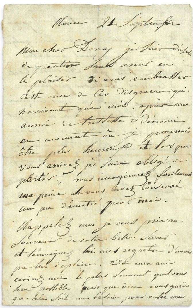 Il est désolé de devoir partir alors que son ami arrive à Rome. «C'est une de ces disgraces qui n'arrivent qu'à moi, après une année de tristesse et d'ennui au moment où je pourrais être plus heureux et lorsque vous arrivez je suis obligé de partir»... Il se rappelle au souvenir de la belle-soeur de Dorcy, puis ajoute qu'il laisse «quelques effets qui pourront vous être utiles tels que chevalet, boëte à couleurs, toiles préparées, puis je vous enverrai un vieil homme très intelligent pour vous chercher un atelier. Quand vous l'aurez trouvé mettez vous de suite à l'ouvrage c'est le seul moyen de ne pas connaitre l'ennui»...