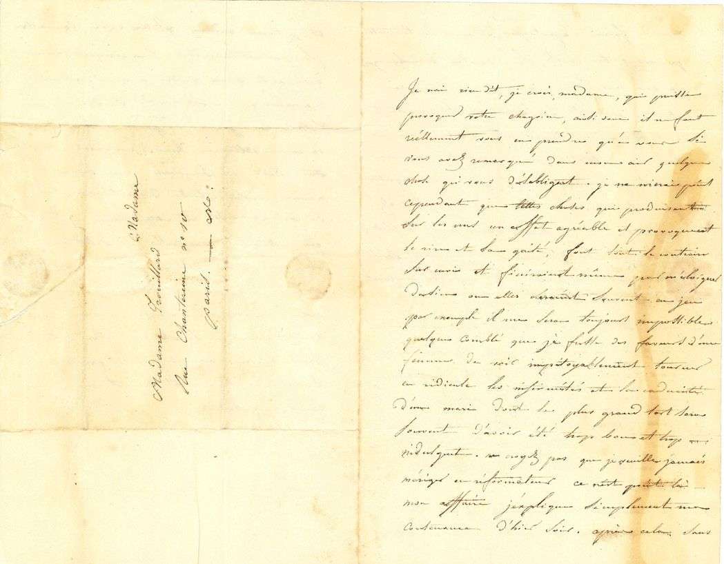 Belle lettre galante, au lendemain d'une soirée chez la dame. «Je n'ai rien dit, je crois, madame, qui puisse provoquer votre chagrin, ainsi donc il ne faut réellement vous en prendre qu'à vous si vous avez remarqué dans mon air quelque chose qui vous désobligeat. Je ne nierai point cependant que telles choses qui produisent sur les uns un effet agréable et provoquent le rire et la gaîté, font tout le contraire sur moi et finiraient même par m'éloigner du lieu où elles seraient souvent en jeu. Par exemple il me sera toujours impossible quelque comblé que je fusse des faveurs d'une femme de voir impitoyablement tourner en ridicule les infirmités et la caducité d'un mari dont le plus grand tort sera souvent d'avoir été trop bon et trop indulgent. Ne croyez pas que je veuille jamais m'ériger en réformateur ce n'est point là mon affaire j'explique simplement ma contenance d'hier soir. Après cela sans vouloir faire l'apologie de mes sentiments que vous trouverez sans doute bien bourgeois je dois vous déclarer que je n'en changerai jamais, qu'avant de se lier il est important de se bien connaître et qu'en conséquence je vous dirai toutes mes impressions comme elles se présenteront car j'aurais à regretter plus tard de voir que vous vous fussiez méprise. Je ne serai donc jamais flatteur. Si vous m'intéressiez moins, il me serait facile d'être plus liant, on passe en effet facilement sur les déffauts de ceux que l'on n'aime pas et que l'on a peu besoin d'estimer. Soyez bien assurée que les femmes chercheront longtems avant de trouver quelque chose qui les pare mieux que la pudeur et la modestie et que tous les avantages de l'esprit ne sauraient relever la dépravation du coeur»... Il n'était point peiné par la venue de M. Parceval, «mais ce que je n'aime point du tout ce sont vos relais de complaisants et cette troupe de soupirants qui assiegent vos portes et s'etablissent d'autorité chez vous, mais comme [...] je rougirais de leur enlever une seule faveur je leur laisse volontiers le champ libre. Tout ce bruit là ne me va pas et pour vous l'habitude si ce n'est le gout en a du faire un besoin»...