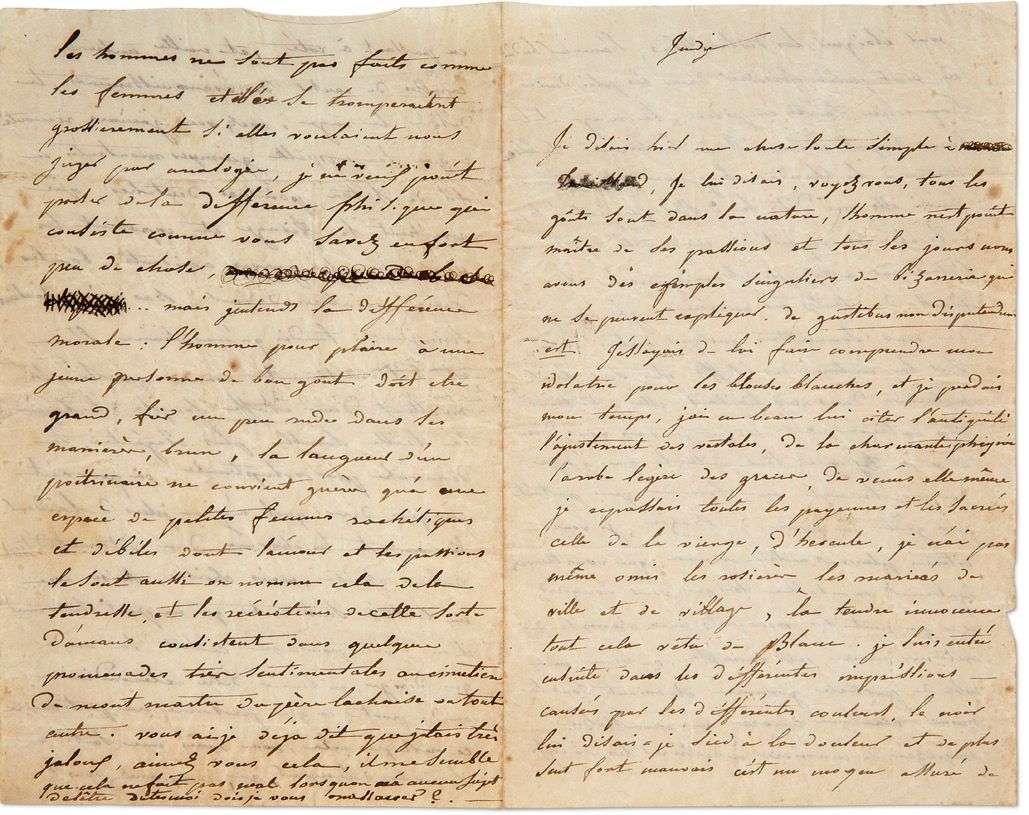 Étonnante lettre de passion amoureuse. «Je disais hier une chose toute simple à [Madame Trouillard biffé], je lui disais, voyez vous, tous les goûts sont dans la nature, l'homme n'est point maître de ses passions et tous les jours nous avons des exemples singuliers de bizarrerie qui ne se peuvent expliquer. De gustibus non disputandum est. J'essayais de lui faire comprendre mon idolatrie pour les blouses blanches, et je perdais mon temps, j'ai eu beau lui citer l'antiquité, l'ajustement des vestales, de la charmante Phryné, la robe légère des graces, de Vénus elle-même, je repassais toutes les payennes et les sacrées, celle de la Vierge, d'Hercule, je n'ai pas même omis les rosières, les mariées de ville et de village, la tendre innocence, tout cela vêtu de blanc. Je suis entré ensuite dans les différentes impressions causées par les différentes couleurs, le noir lui disais-je sied à la douleur et de plus sent fort mauvais c'est un moyen assuré pour éloigner les distractions, l'amour badin ne vient point folatrer dans les plis d'une serge noire teinte en pièce, le rouge et le brun sieyent à merveille à la brune, le bleu tendre à la blonde, le jaune est à faire fuir. Elle me dit là dessus que j'étais trop délicat et voyant de mon coté quelle ne l'était pas assez pour bien apprécier la finesse de toutes ces nuances j'ai imaginé de vous soumettre quelques autres idées sur la nature des étoffes et sur leur influence dans nos liaisons. Elle eut trouvé trop extraordinaire ce que je vais vous dire et vous jugerez tout naturel que j'aye presque étranglé une femme qui portait par goût un jupon de bazin, je vous citerais plusieurs autres crimes que vous trouverez également excusables lorsque vous songerez à ce qui peut les provoquer: une chemise de cretonne neuve, par exemple, ou bien une robe de perkale gommée et criant sous la main ou bien encore en mousseline empezée de manière à déchirer les doigts en passant à coté, et mille autres capables de causer des évanouissements, le délire la rage, avez vous jamais rencontré ce que l'on appelle guimpes montantes en fil de léton, pointues dentelées, qui arrachent le visage et exposent les yeux aux plus graves accidents, boucles d'acier, ceintures de cuir, bas noirs, souliers serin-jaunes| tandis qu'au contraire l'âme est délicieusement émue par les plis moëlleux d'une étoffe souple et légère, la taille semble plus élégante, la démarche plus voluptueuse, on pourrait presque dire qu'il n'y a plus de laideur là où est le charme d'un vêtement délicat et bien choisi, mais choisi, choisi avec un certain sentiment qui ne peut se donner. Il ne faut point que ce soit la mode qui dirige, ni l'envie d'être extraordinaire ou de porter ce que personne ne porte encore ce n'est pas cela, non mais une sorte de lascivité, de langueur qui, comprenez vous ? Les hommes ne sont pas faits comme les femmes et elles se tromperaient grossièrement si elles voulaient nous juger par analogie, je ne veux point parler de la différence phisique qui consiste comme vous savez en fort peu de chose [quelques mots rayés]... mais j'entends la différence morale: l'homme pour plaire à une jeune personne de bon gout doit être grand, fier un peu rude dans ses manières, brun, la langueur d'un poitrinaire ne convient guères qu'à une espèce de petites femmes rachitiques et débiles dont l'amour et les passions le sont aussi. On nomme cela de la tendresse, et les récréations de cette sorte d'amans consistent dans quelques promenades très sentimentales au cimetière de Montmartre du Père Lachaise ou tout autre. Vous ai-je déjà dit que j'étais très jaloux, aimez vous cela, il me semble que cela ne fait pas mal lorsqu'on n'a aucun sujet de l'être dites-moi dois-je vous massacrer ?»