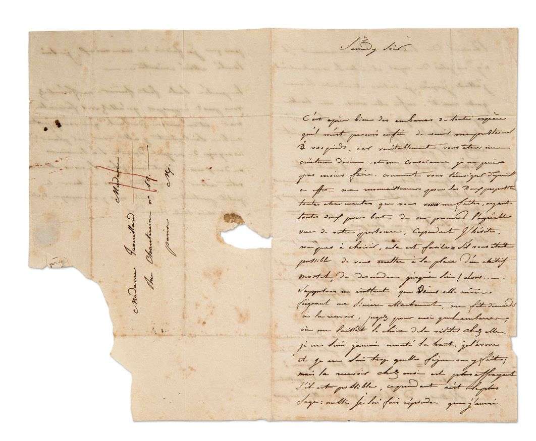 L.A., «Samedy soir» [ juillet ? 1822], à Mme TROUILLARD, rue Chantereine n° 10 à Paris| 2 pages et demie in-8, adresse (petite déchirure par bris du cachet sans atteinte au texte, et un coin manquant dans le bas du feuillet d'adresse sans toucher le texte).