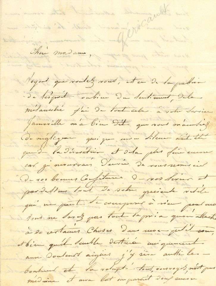 Jolie lettre de flirt sentimental avec Louise Vernet, pendant sa maladie. «Voyons que voulez vous, est-ce de la passion de l'esprit ou bien du sentiment, de la mélancolie J'ai de tout cela à votre service «... Son silence n'a été «que de la discrétion et de la plus fine encore car je mourrais d'envie de vous remercier de vos bonnes confitures de vos livres et par-dessus tout de votre gracieuse visite qui ne peut se comparer à rien pour moi. Vous ne savez pas tout le prix qu'on attache à de certaines choses dans mon petit coin, et bien qu'il semble destiné uniquement aux douleurs aigües j'y rêve aussi le bonheur et la volupté. [...] Vous êtes aimable assurément d'être venue me voir mais de m'avoir laissé là ensuite ne sent-il pas un peu son bourreau, après tout vous n'êtes pas payée pour me faire plaisir que je vous payerais volontiers ! écoutez moi jusqu'au bout et ne vous fachez pas, je suis malade et vous savez qu'aux gens de cette espèce l'on passe bien des choses. Les fantaisies appartiennent aux enfants, aux malades, quelques uns disent aux femmes. Je n'oserais l'affirmer, mais je désirerais bien qu'il vous en passât une par la tête, une seule [...] N'allez pas croire au moins que le chère Madame qui s'est échappé de ma plume en m'adressant à vous soit une vanité, ce n'est point du tout le synonyme du Chère Louise dont vous faites si peu de cas, je ne veux point faire rire de moi, mais je trouve le madame si imposant que j'ai essayé de vous le dire un peu plus affectueusement, comme une ancienne connaissance semble m'y autoriser et j'ose croire aussi un peu de vieille amitié»». Il demande des nouvelles de la «belle et jolie voisine» de Mme Vernet [probablement la baronne LALLEMAND, femme du général]: «on m'a fait espérer qu'elle voudrait bien me recevoir, je ne fais qu'y rêver. Aussi je me dépêche de traiter avec mes bourreaux| croyez vous que cela tienne à mon mal ? Je la vois charmante, douce surtout et bienveillante presque caressante aussi et n'opposant à mes voeux qu'une résistance légère. Je ne la connais pas du tout mais ne lui dites pas un mot de tout cela elle m'accuserait de présomption lorsque ce ne sont que des rêves ne lui dites pas non plus que l'on s'est joué de moi quelques fois, pour le coup cela lui en donnerait aussi la fantaisie»...