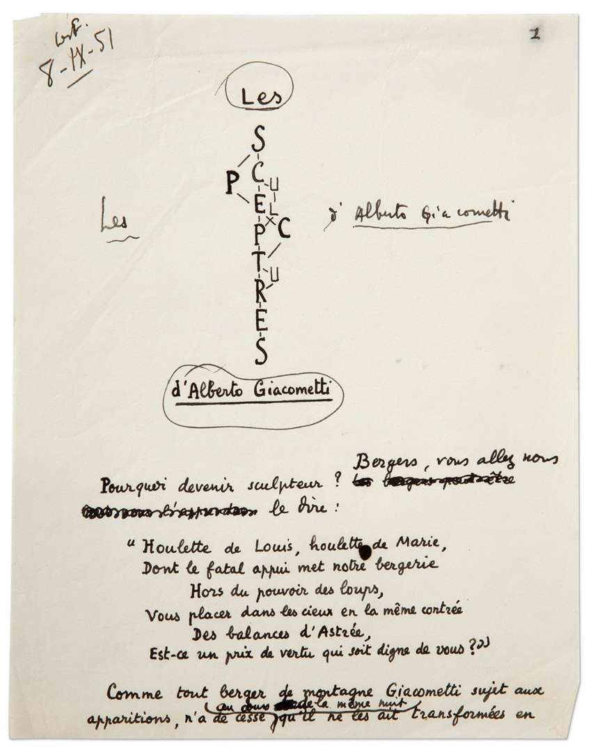 Précieux échange entre le sculpteur et le poète, et ensemble de manuscrits retraçant la genèse et l'élaboration des textes de Francis Ponge sur Giacometti.
