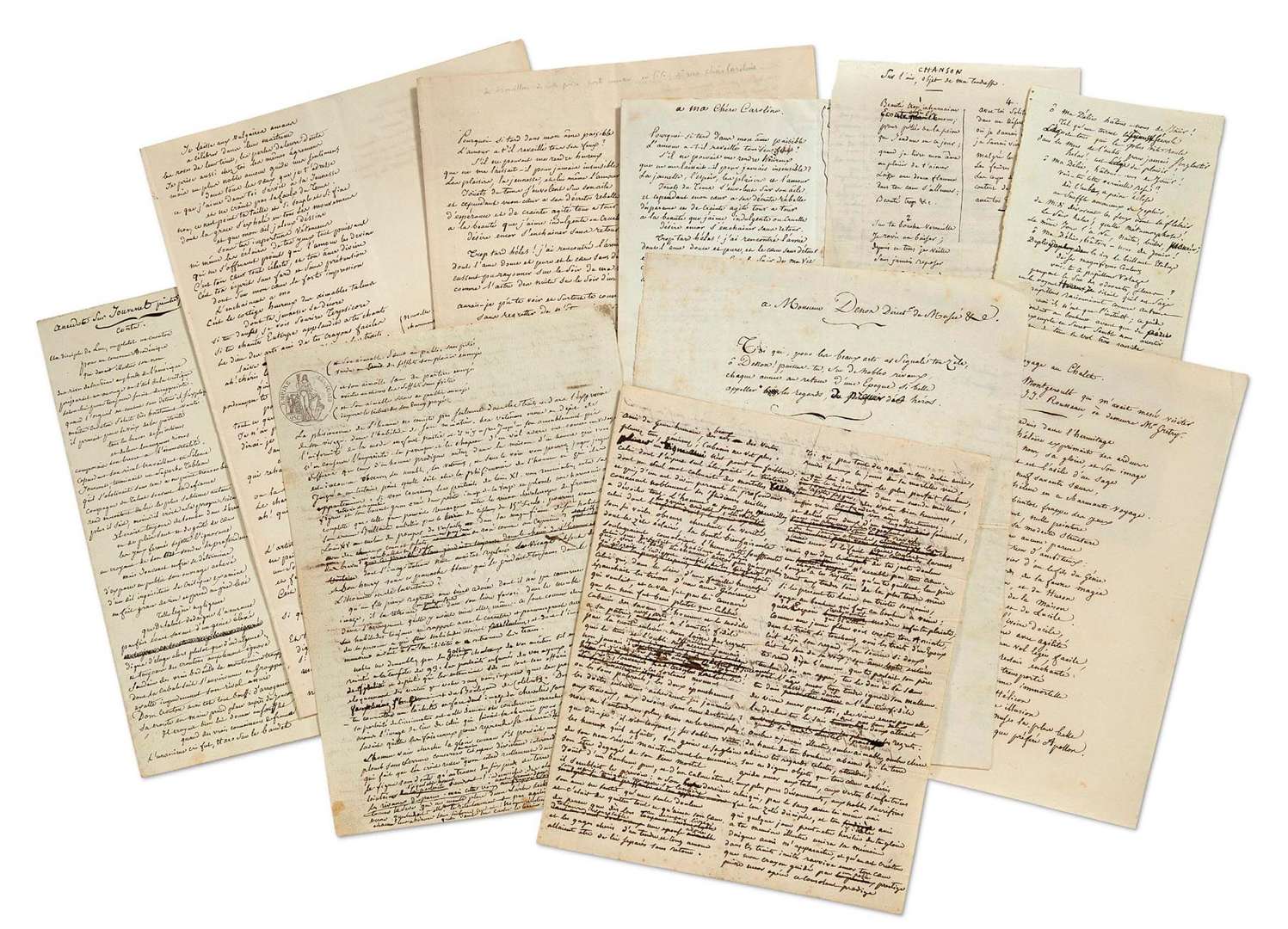 À ma chère Caroline, longue épître (plus de 200 vers) en deux versions: manuscrits de travail avec ratures et béquets| et mise au net sans titre: «Pourquoi si tard dans mon âme paisible / L'amour a-t-il reveillé tous ses feux ?»...