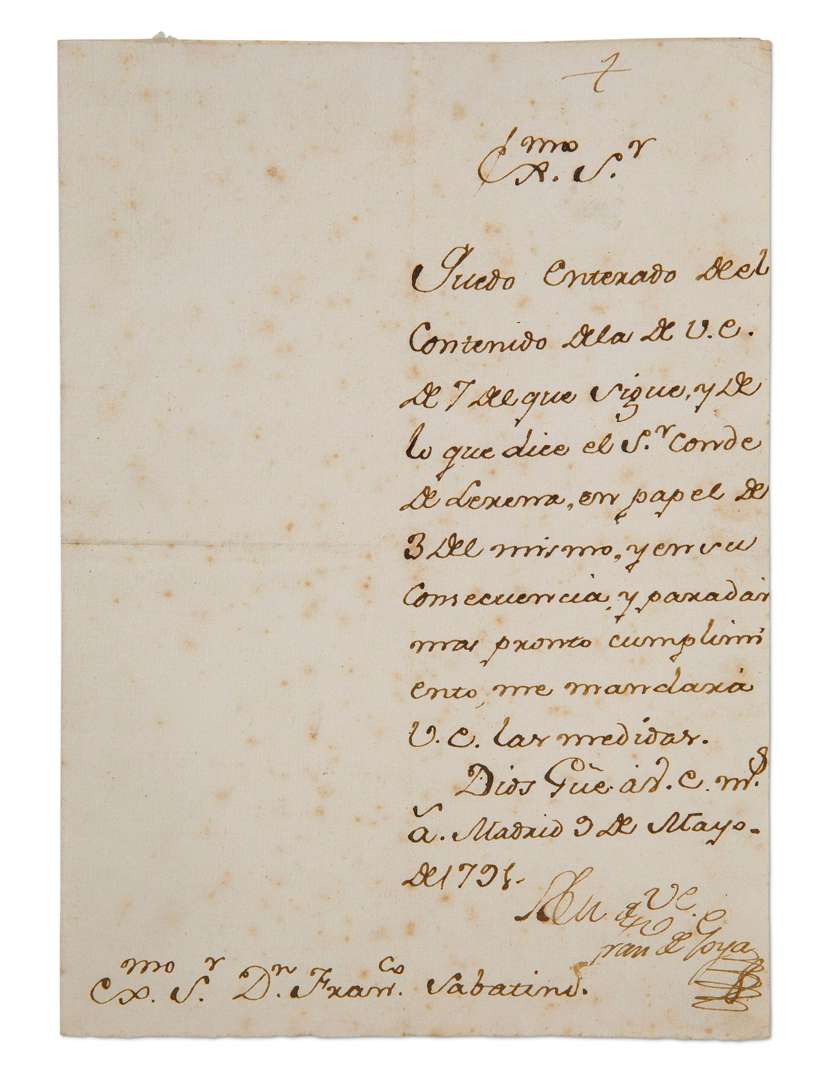 L.S. avec compliment autographe «Blm de VE Fran° de Goya», Madrid 9 mai 1791, à Francisco SABATINI| 1 page in-4 (légères rousseurs)| en espagnol.