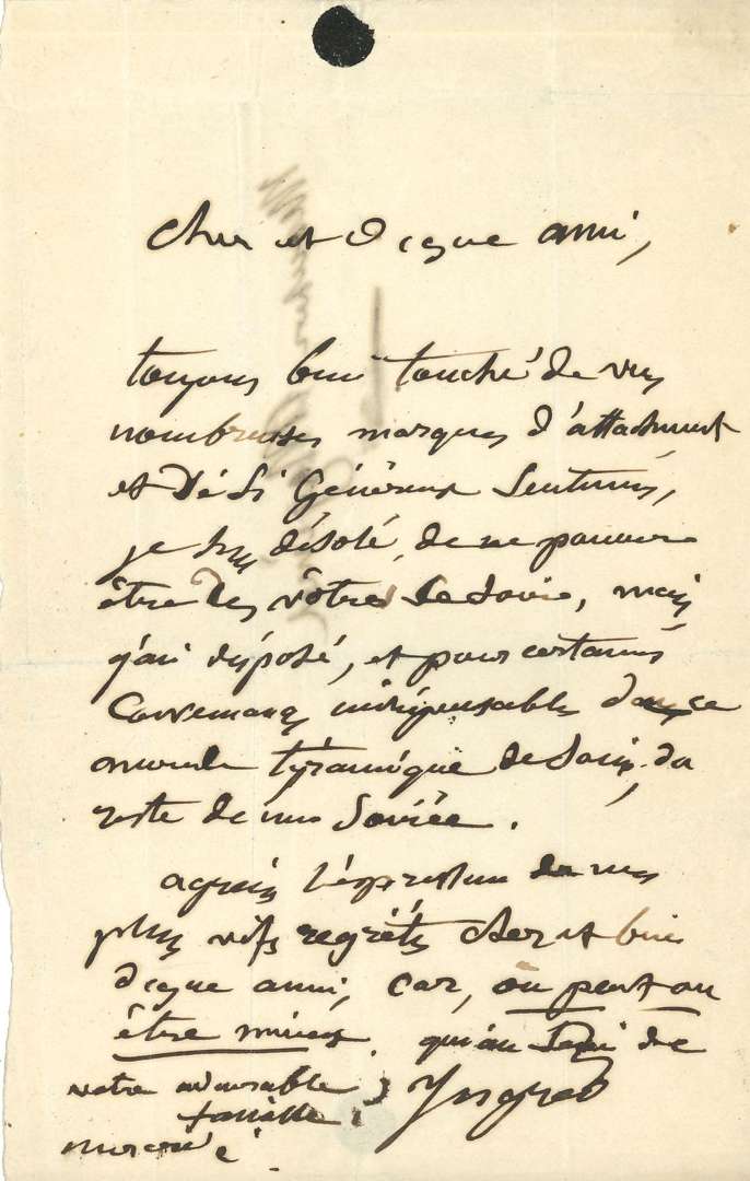 L.A.S. «Ingres», mercredi, au peintre Albert MAGIMEL| 1 page in-8, adresse au dos. «Cher et digne ami, toujours bien touché de vos nombreuses marques d'attachement et de si généreux sentimens, je suis désolé de ne pouvoir être des vôtres ce soir, mais j'ai disposé, et pour certaines convenances indispensables dans ce monde tyrannique de soirs, du reste de ma soirée». Il regrette, «car, où peut-on être mieux qu'au sein de votre adorable famille»...