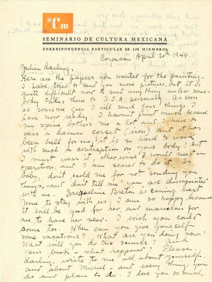 Elle lui envoie les papiers demandés pour la peinture. Elle ne peut pas lui envoyer d'autres tableaux, car c'est trop difficile, à moins que quelqu'un ne les emporte aux U.S.A.| quand quelqu'un y partira, elle lui donnera ce qu'elle aura de prêt. Elle n'a pas beaucoup peint car sa colonne vertébrale lui fait si mal qu'elle est obligée de porter ce satané corset (de fer) - c'est un enfer - c'est si difficile de travailler avec ce genre d'engin sur le corps ! Mais elle doit le porter, sinon elle sera obligée de subir une opération qui lui fait peur. Que Julien ne la gronde donc pas. Elle se réjouit de la venue de Jacqueline BRETON, qui va séjourner non loin d'elle. Elle incite Julien à venir et à prendre des vacances. Elle l'aime tant et l'aimera toujours. Faisant allusion à l'une de ses peintures, elle lui demande s'il pense à elle quelquefois, avec ou sans les trois lunes... «Julien darling [...] I haven't paint much because my spine bothers me a lot and I have to wear a damn corset (iron) and it has been hell for me| it is so hard to work with such a contraption on your body ! But I must wear it, otherwise I would need an operation and I am scared to do it. So baby, don't scold me for not sending you things [...] Jacqueline Breton iscoming next June to stay with us. [...] When can you give yourself some vacations ? [...] I love you so much and will always love you [...] Do you think of me some times ? with the three moons or without the moons ?»...