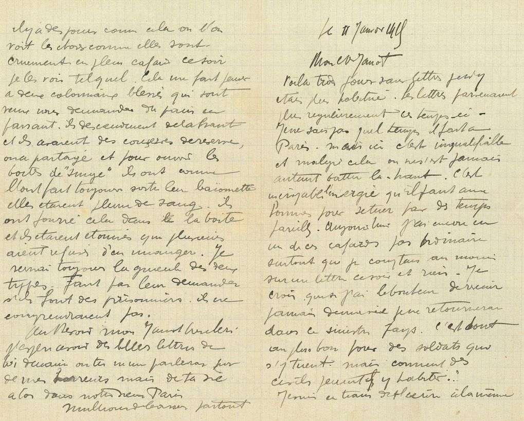 Belle et émouvante lettre du front en Argonne, à sa marraine de guerre et future femme. [Jeanne LOHY (1895-1950), rencontrée avant la guerre dans les milieux artistiques, fut la marraine de guerre de Fernand Léger, qui l'épousera officiellement en 1919. La lettre est adressée à «Madame Léger» chez «Serge Jabstrebzoff», le peintre Serge Férat.] «Mon cher Janot, voilà trois jours sans lettres je n'y étais plus habitué. [...] Je ne sais pas quel temps il fait à Paris, mais ici c'est inqualifiable et malgré cela on ne s'est jamais autant battu là-haut. C'est incroyable l'énergie qu'il faut aux hommes pour se tuer par des temps pareilles. Aujourd'hui j'ai encore un de ces cafards pas ordinaire, surtout que je comptais au moins sur une lettre ce soir et rien. Je crois que si j'ai le bonheur de revenir jamais de ma vie je ne retournerai dans ce sinistre pays. C'est tout au plus bon pour des soldats qui s'y tuent. Mais comment des civils peuvent-ils y habiter ? [...] j'entends toujours cette sacrée mitrailleuse qui tient à se faire entendre chaque fois que je t'écris. On doit attaquer dur du côté du 2e corps Toute la journée une canonnade formidable, et ensuite lorsque l'on pousse à fond, c'est l'infanterie et les mitrailleuses. [...] Dire qu'à la minute où je t'écris il y a des hommes qui sous une pluie glacée qui tombe en rafale, dans de la boue jusqu'aux genoux, se lancent les uns sur les autres à coups de baïonnette. Pense, Janot, à ce qu'ils feraient s'il n'étais pas à la guerre [...] Pense à tous ces pauvres gars qui sont en train de crever tout doucement en pleine connaissance entre deux tranchées, sachant qu'ils vont y mourir sans aucun secours. Avant-hier tout un peloton de ma compagnie a été enveloppé. Nous restons 4 de l'escouade sur 15. Que sont-ils devenus. On ne le saura jamais. Nous savons par qquns qui ont pu se sauver qu'ils ont tenu presque jusqu'au bout. Quand ils n'ont plus eu de cartouches ils ont pris les pioches et les barres à mine, ils se sont battus comme des sauvages après avoir passé 16 jours là-haut avec un repas par jour. Quand on apprend après cela qu'il y a des premières au Moulin-Rouge cela vous casse les pattes. C'est terrible de penser que Paris rigole et que tant de pauvres diables se font casser la figure. Je m'aperçois, mon Janot, que je t'écris une lettre sinistre. Il y a des jours comme cela où l'on voit les choses comme elles sont, cruement en plein cafard ce soir je les vois tel quel». Il raconte le passage de deux coloniaux blessés avec qui il a partagé des conserves, «et pour ouvrir les boîtes de “singe” ils ont comme l'ont fait toujours sorti leur baïonnette elles étaient pleines de sang. Ils ont fourré cela dans la boîte et ils étaient étonnés que plusieurs aient refusé d'en manger. [...] Au revoir mon Janot très chéri. J'espère avoir des belles lettres de toi demain où tu ne me parleras pas de mes horreurs mais de ta vie à toi dans notre vieux Paris. Millions de baisers partout.»