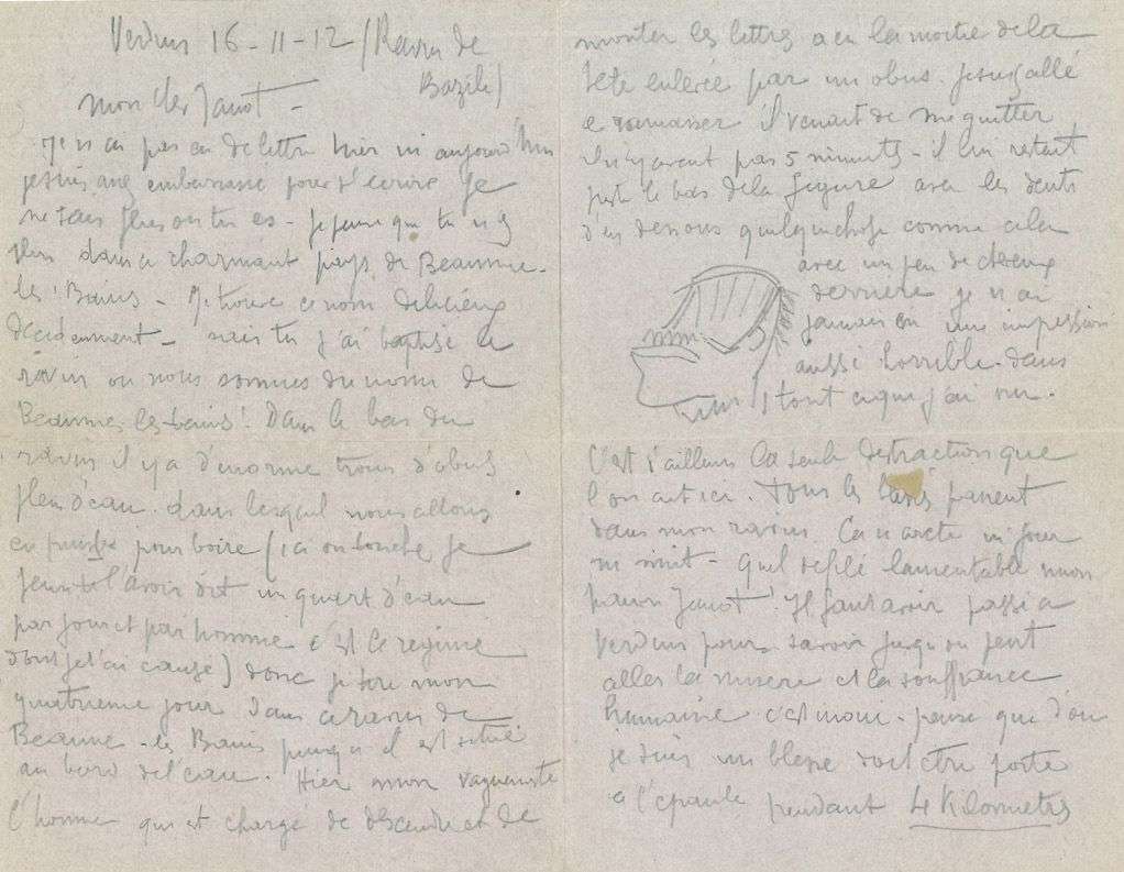 Il ne sait plus où est son Janot| elle a dû quitter «ce charmant pays de Beaume-les-Bains», et il a baptisé le ravin où il se trouve de «ce nom délicieux [...] Dans le bas du ravin il y a d'énormes trous d'obus pleins d'eau dans lesquels nous allons puiser pour boire (ici on touche je pense te l'avoir dit un quart d'eau par jour et par homme) donc je tire mon quatrième jour dans ce ravin de Beaume-les-Bains puisqu'il est situé au bord de l'eau. Hier mon vaguemestre l'homme qui est chargé de descendre et de monter les lettres a eu la moitié de la tête enlevée par un obus. Je suis allé le ramasser il venait de me quitter il n'y avait pas 5 minutes. Il lui restait juste le bas de la figure avec les dents d'en dessous quelque chose comme cela [dessin de la tête] avec un peu de cheveux derrière. Je n'ai jamais eu une impression aussi horrible dans tout ce que j'ai vu. [...] Tous les blessés passent dans mon ravin. Ça n'arrête ni jour ni nuit. Quel défilé lamentable [...] Il faut avoir passé à Verdun pour savoir jusqu'où peut aller la misère et la souffrance humaine c'est inoui. Pense que d'où je suis un blessé doit être porté à l'épaule pendant 4 kilomètres dans un chemin à peine tracé continuellement battu par l'artillerie. Penses tu à cela ce pauvre diable tout saignant tout couvert de boue et transi de froid ou trempé par la pluie 4 kilomètres il faut 2 h ½ à 3 heures avant d'atteindre les voitures sanitaires. C'est un désert tu sais Verdun, un désert fabriqué par l'artillerie moderne où il ne reste rien que de la terre remuée et des débris d'homme mélangés avec. Il faut vivre là-dedans. Si j'en reviens, je serai content d'avoir vu cela car j'aurai vu la guerre dans ce qu'elle a de pire. On ne peut pas aller plus loin - c'est impossible»...
