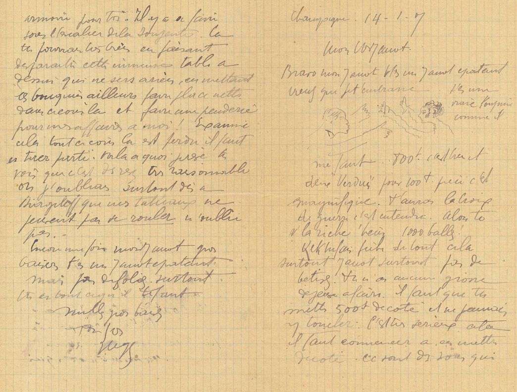 Un dessin à la plume en tête de la lettre représente Fernand Léger et Jeanne Lohy se jetant dans les bras l'un de l'autre. «Bravo mon Janot, t'es un Janot épatant. Viens que je t'embrasse. T'es une vraie Youpine comme il me faut. 800 f. c'est bien et deux “Verdun” pour 100 f. pièce c'est magnifique. T'auras la croix de guerre c'est entendu. Alors te v'là riche hein 1000 balles ! Kektufais fiche de tout cela. Surtout Janot surtout pas de bêtises. Tu n'as aucune grosse dépense à faire. Il faut que tu mettes 500 f. de côté et ne jamais y toucher. C'est très sérieux cela, il faut commencer à en mettre de côté. Ce sont des sous qui tombent très bien»...