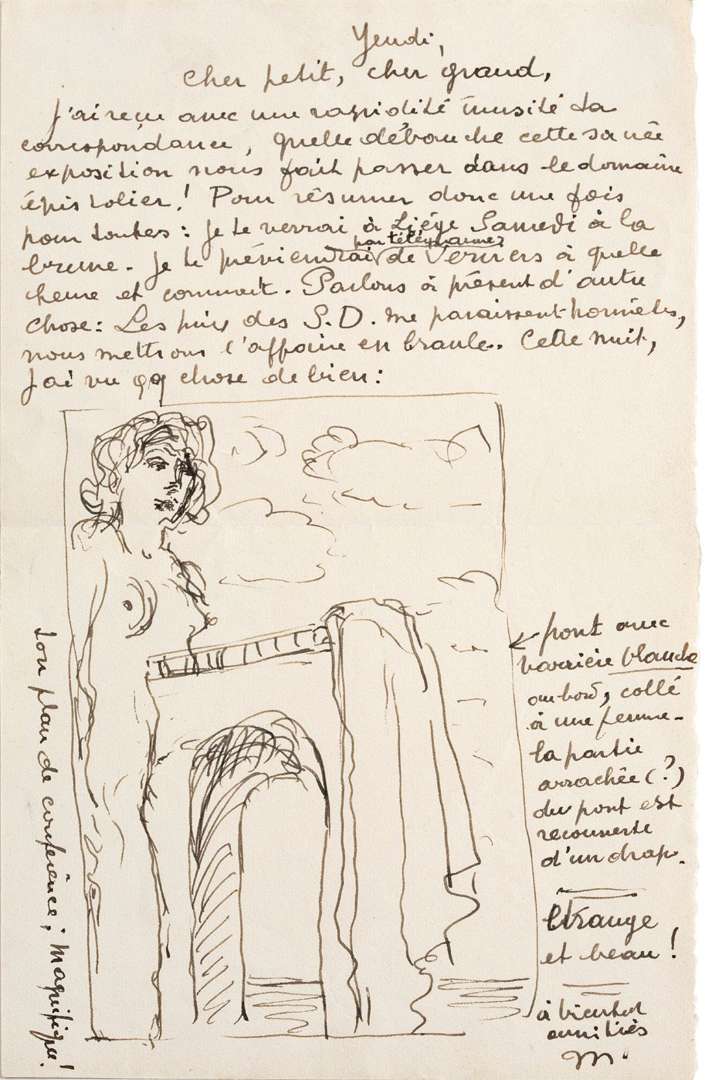 Très belle lettre avec un magnifique dessin d'érotisme onirique. «Cher petit, cher grand, J'ai reçu avec une rapidité inusitée ta correspondance, quelle débauche cette sacrée exposition nous fait passer dans le domaine épistolier ! Pour résumer donc une fois pour toutes: je te verrai à Liège samedi à la brune. Je te préviendrai par télégramme de Verviers à quelle heure et comment. Parlons à présent d'autre chose: les prix des S.D. me paraissent honnêtes, nous mettrons l'affaire en branle. Cette nuit j'ai vu qq chose de bien».