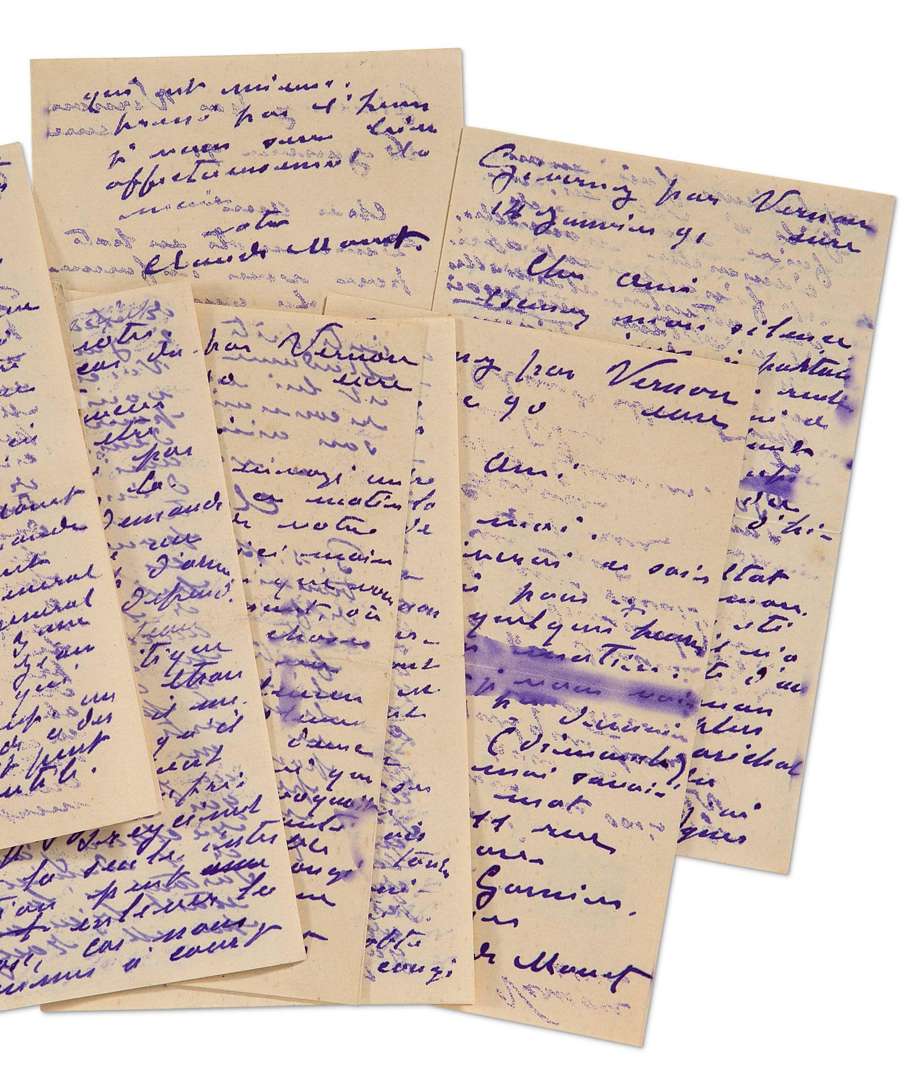 Rare lettre de jeunesse écrite à l'âge de 19 ans lors du premier séjour de Monet à Paris, sur ses caricatures. [La lettre est signée de l'initiale de son premier prénom, Oscar, que Monet utilisait aussi pour signer les caricatures qu'il dessinait alors pour gagner sa vie. Grâce à sa tante Lecadre, le jeune Monet a fait la connaissance du peintre Armand GAUTIER (1825-1894), qui va le prendre sous sa protection, et dont il sera un temps l'élève.] «Je viens vous expliquer le motif qui m'empêche d'aller travailler chez vous depuis 3 jours et vous prie de ne pas attribuer ceci à la paresse. La fortune vient à mon secours. Je fais en ce moment la charge de Pierre Petit [le photographe Pierre PETIT (1831-1909)] dans le Gaulois et dans le Charivari. J'ai aussi plusieurs charges du Particulier à faire. Je suis très content de tout cela car ça va me remettre un peu à flots, dès que j'aurai terminé je reviendrai travailler»...
