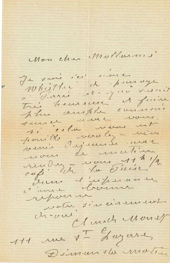 Dimanche matin. «Mon cher Mallarmé Je suis ici avec Whistler de passage à Paris et qui serait très heureux de faire plus ample connaissance avec vous. Si cela vous est possible, voulez-vous venir déjeuner avec nous ce matin [...] café de la Paix»... Il donne son adresse «111 rue St Lazare».