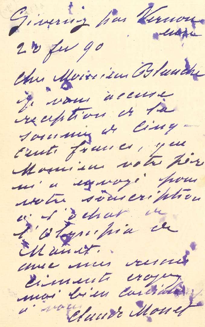 Souscription pour l'achat d'Olympia de Manet, afin de l'offrir au musée du Louvre. [Le jeune peintre Jacques-Émile BLANCHE (1861-1942) était un des souscripteurs| on voit ici que c'est son père, le célèbre médecin aliéniste, qui a payé.] «Je vous accuse réception de la somme de cinq cents francs, que Monsieur votre père m'a envoyé pour votre souscription à l'achat de l'Olympia de Manet»...
