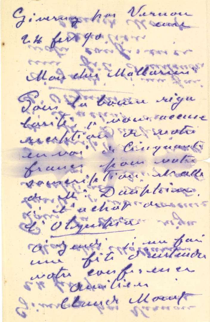 Sur la souscription pour l'Olympia de Manet. 22 février. «Mon cher Mallarmé Vous serez bien aimable de m'adresser le plus tôt possible le montant de votre souscription ainsi que celle de votre ami Monsieur Dauphin. Je voudrais pouvoir en terminer et remettre la totalité de la souscription à Madame Édouard Manet, avant la réponse officielle du Ministre»... 24 février. «Mon cher Mallarmé Pour la bonne régularité, je vous accuse réception de votre envoi de cinquante francs pour votre souscription et celle de Mr Dauphin à l'achat de l'Olympia. À Jeudi, je me fais une fête d'entendre votre conférence»... [Le 27 février, Mallarmé prononça chez Berthe Morisot sa conférence sur Villiers de l'Isle-Adam.]