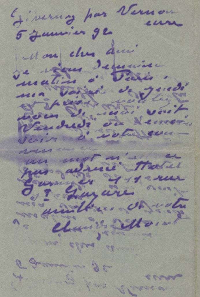 3 L.A.S. «Claude Monet», Giverny janvier-mai 1892, à Stéphane MALLARMÉ| 1, 1 ½ et 1 ½ pages in-8, à l'encre violette, enveloppe pour la dernière (encre un peu délavée avec décharges d'encre, fente réparée au dos à la 2e). 6 janvier. Il vient à Paris: «voulez-vous de moi, soit Vendredi ou demain soir à votre convenance»... 28 février. «C'est en arrivant de Rouen, où je suis en plein travail, que je trouve votre aimable missive. Je pars ce soir pour Paris pour y passer la journée de demain lundi, le matin pour accrocher les peupliers, et le tantôt pour faire les honneurs de ma petite exposition. Je vous y verrai et nous causerons»... [L'exposition des Peupliers va s'ouvrir chez Durand-Ruel le 1er mars.] 11 mai. «Je ne veux pas vous laisser plus longtemps sous la mauvaise impression de notre dernière conversation. Je me soumets en songeant au plaisir de vous avoir une journée à Giverny, car vous savez qu'il n'est pas possible de venir ici autrement que par le train de 8 h. du matin, et que le frugal déjeuner du peintre est de rigueur. Mais que ces Messieurs ne s'attendent pas à trouver un grand choix de tableaux chez moi, le nombre de choses possibles pour un musée est très restreint»...