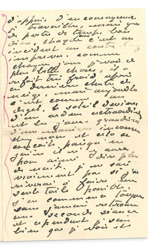 Il s'inquiétait du silence de sa «bonne femme chérie», mais le courrier était retardé par le mauvais temps. Il est désespéré de la «voir si découragée [...] je ne te cache pas que lorsque un jour passe sans lettre de toi je suis sans courage, car j'ai plus que jamais besoin d'appui, d'encouragement. Je travaille, mais que de perte de temps. Bon dieu, chaque jour c'est un incident un contre-temps imprévu. Comme chaque jour je vois de plus belles choses, il a refait très froid après ces dernières chutes de neige, mais aujourd'hui c'est comme un dégel. Le soleil devient d'une ardeur extraordinaire et les jours grandissent d'une manière inconnue chez nous [...] en juin il n'y aura pour ainsi dire plus de nuit. Je ne sais vraiment pas si j'arriverai à faire une seule toile possible. J'en commence toujours sans jamais retrouver une seconde séance et cependant je sais bien que je vois et comprends mieux comment rendre cette nature. Mais il faudrait des mois pour cela, et je redoute que d'un jour à l'autre le dégel soit complet. Ce qu'il y a de bête et de regretable c'est de m'être mis dans la tête de rapporter quelque chose, on ne vient pas ainsi dans un pays si différent se mettre à le peindre de but en blanc. Cela m'a empêché de voir un peu la Norvège d'où je reviendrai n'ayant vu que les environs de Christiania. [...] je me ronge absolument, pardonne-moi, mais tu me connais je ne puis dissimuler et à qui confier mes pensées mes impressions si ce n'est à toi, [...] j'ai besoin de ton soutien pour me remonter. [...] peut-être demain serais-je plus satisfait plus heureux, hier je voyais tout d'un bon oeil, et selon le temps qu'il fera au réveil et surtout si je puis continuer une toile commencée»...