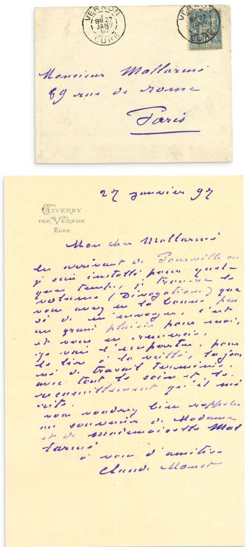 L.A.S. «Claude Monet», Giverny 27 janvier 1897, à Stéphane MALLARMÉ| 1 page grand in-8 à l'encre violette, enveloppe.