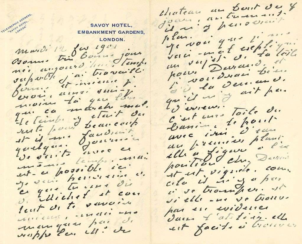 L.A.S. «ton vieux qui t'aime Claude», Londres 12 février 1901, à SA FEMME ALICE| 4 pages in-8 à en-tête du Savoy Hotel.