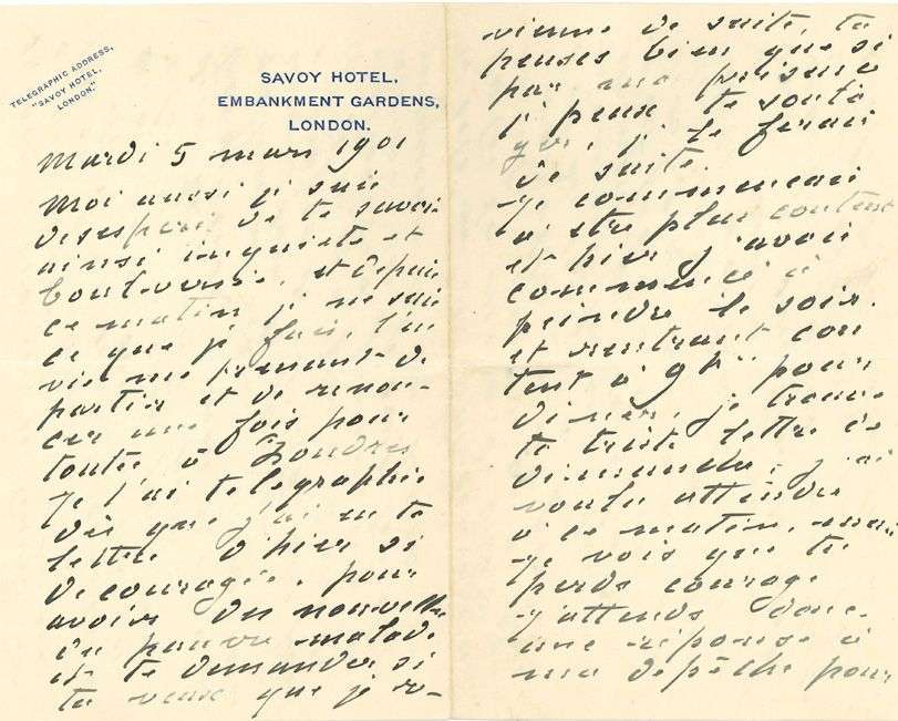 L.A.S. «Claude», Londres 5 mars 1901, à SA FEMME ALICE| 7 pages in-8 à en-tête du Savoy Hotel.