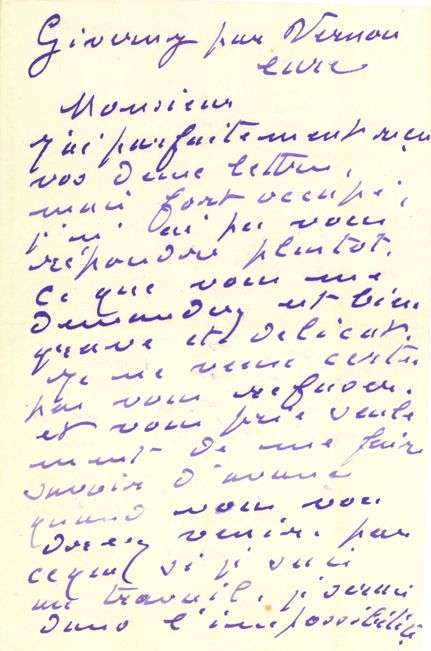 Il a reçu ses deux lettres, «mais fort occupé» n'a pu répondre plus tôt. «Ce que vous me demandez est bien grave et délicat. Je ne veux certes pas vous refuser, et vous prie seulement de me faire savoir d'avance quand vous voudrez venir, parce que si je suis au travail, je serai dans l'impossibilité de vous recevoir, afin que je puisse moi-même vous fixer le jour et l'heure»...