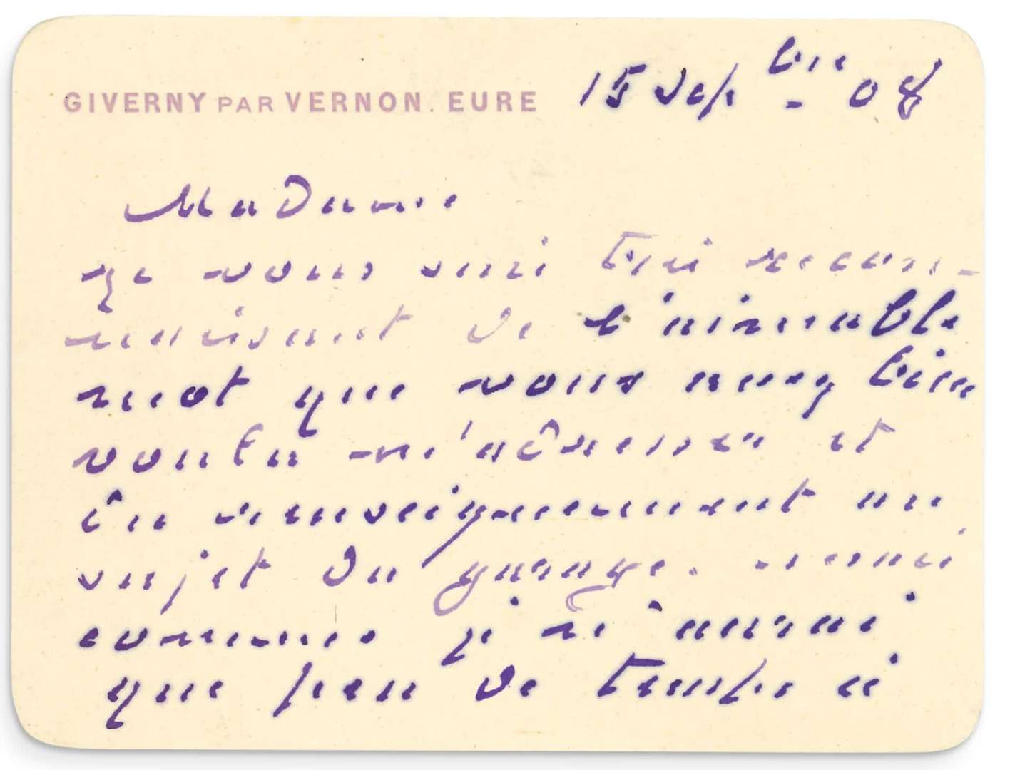L.A.S. «Claude Monet», Giverny 15 septembre 1908, [à Winnaretta SINGER, princesse de POLIGNAC]| 2 pages oblong in-12 à l'encre violette, sur carte à son adresse gravée.